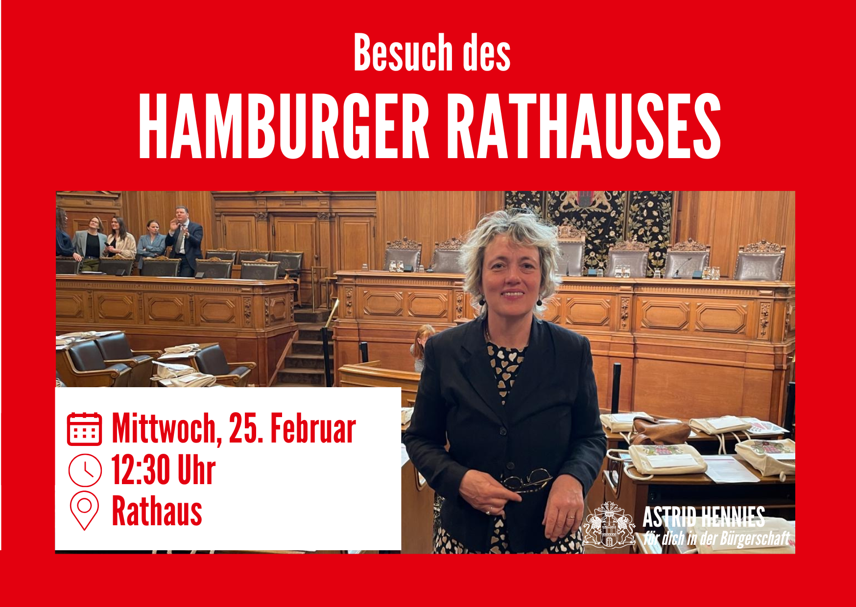 Sehr herzlich lade ich Sie am Mittwoch, den 25. Februar 2026, um 12:30 Uhr, zu einem Besuch des Hamburger Rathauses ein. Nach einer persönlichen Führung durch