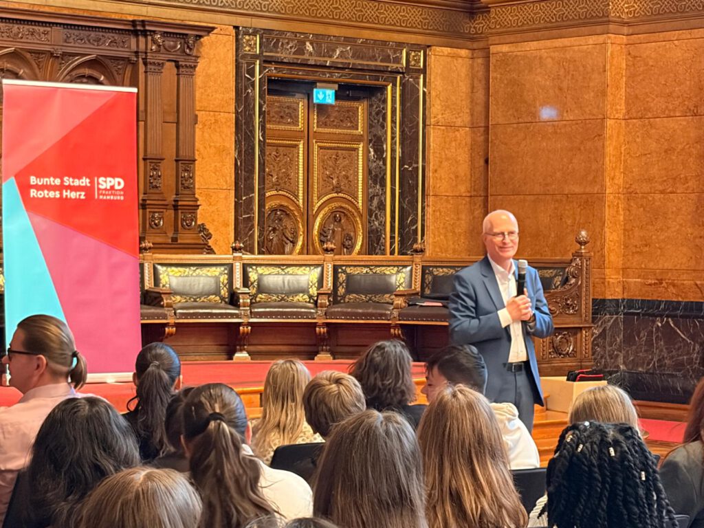 Gestern war das Hamburger Rathaus wieder fest in Mädchenhand: Auf Einladung der SPD-Bürgerschaftsabgeordneten kamen hier Schüler:innen aus ganz Hamburg zum diesjährigen Girls’Day zusammen. Auch ich war mit einer Gruppe aus Rahlstedt dabei. Neben einer spannenden Rallye zu politischen und geschichtlichen Fragen über das Rathaus, hatten die Mädchen Gelegenheit, mit unserem Ersten Bürgermeister Peter Tschentscher, Bürgerschaftspräsidentin Carola Veit und dem SPD-Fraktionsvorsitzenden Dirk Kienscherf in den Austausch zu kommen.