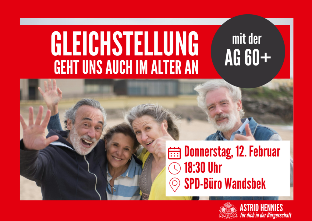Sehr herzlich lade ich gemeinsam mit der Arbeitsgemeinschaft der Senior:innen der SPD Wandsbek – der AG 60plus – zu einem Austausch zum Thema „Gleichstellung geht uns auch im Alter an“ ein. Die Veranstaltung findet statt am Donnerstag, den 12. Februar 2026, um 18:30 Uhr, im SPD-Kreisbüro Wandsbek, Wandsbeker Zollstraße 15, 22041 Hamburg.