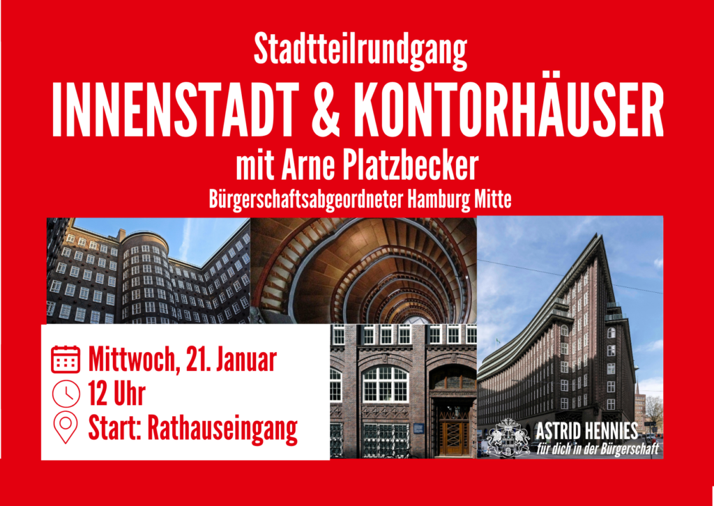 Sehr herzlich lade ich gemeinsam mit meinem Bürgerschaftskollegen Arne Platzbecker aus Hamburg Mitte am Mittwoch, den 21. Januar 2026, zu einem Rundgang durch die Hamburger Innenstadt ein. Der Rundgang steht unter dem Titel „Innenstadt im Wandel – vom Kontor zur Konfliktzone“ und führt durch die historische Altstadt mit einem besonderen Fokus auf die Kontorhausquartiere. Der Rundgang beginnt um 12 Uhr. Treffpunkt ist vor dem Rathauseingang auf dem Rathausplatz.